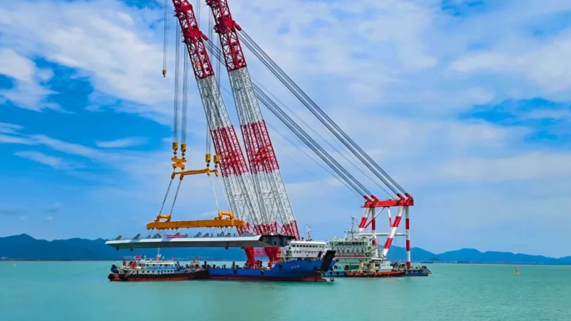 寧波至象山市域(郊)鐵路象山港跨海大橋主橋邊跨結合梁架設,巨力索具鋼箱梁吊具全程保障項目吊裝。