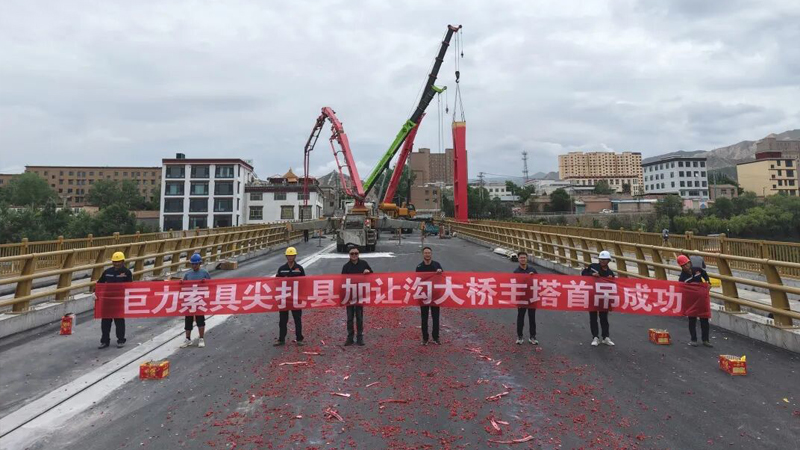 6月20日,加讓溝大橋主塔首吊作業取得圓滿成功,巨力索具股份有限公司承建了該項目的所有上部懸索結構,包括基座及主塔鋼結構,索鞍和索夾鋼結構,懸索橋主纜,吊桿用鋼拉桿及錨固鋼拉桿。