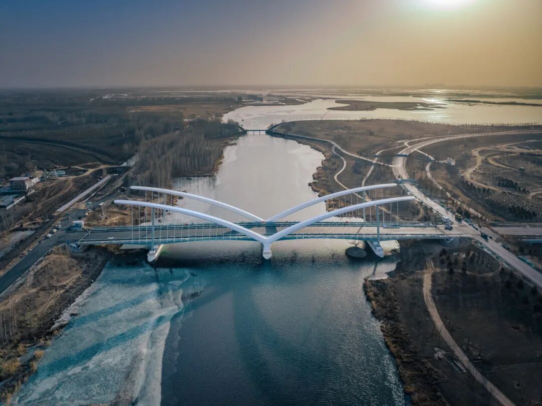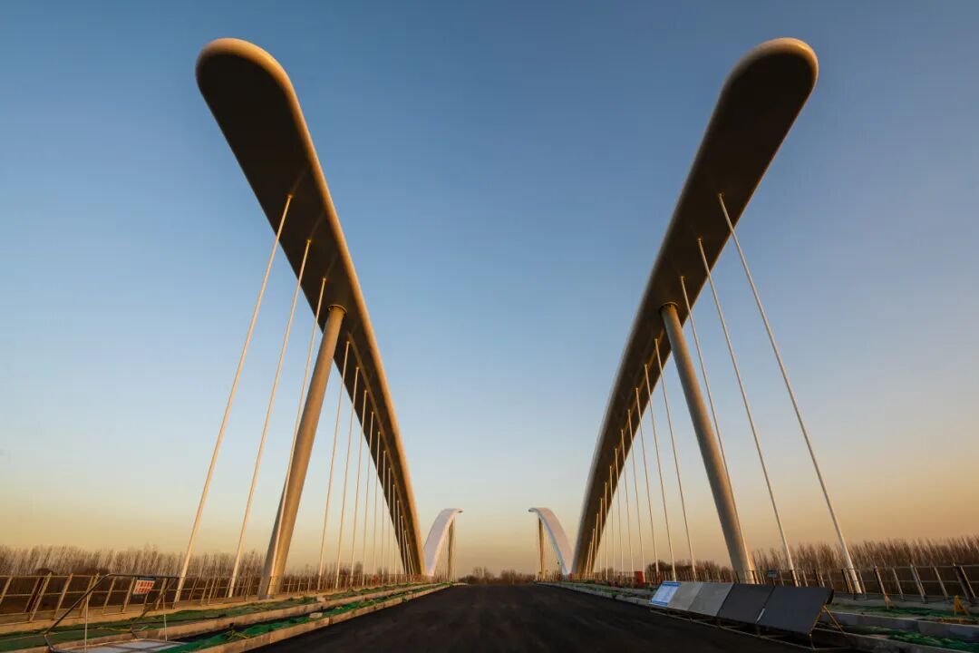 大橋全長(zhǎng)259米,造型以鷺鷥涉水時(shí)舒展的羽翼為原型,取展翅翱翔,高飛于空的意境,將人文理念融合于雄安灣生態(tài)自然的景觀中。以“展翅高飛”為景觀主題,塑造整體協(xié)調(diào)、重點(diǎn)突出的夜間燈光效果,營(yíng)造“清新、亮麗、現(xiàn)代、雅致“的夜間橋梁景觀形象。橋梁全線(xiàn)有功能照明和可分級(jí)控制的景觀照明,為平日和節(jié)日提供不同的照明效果。