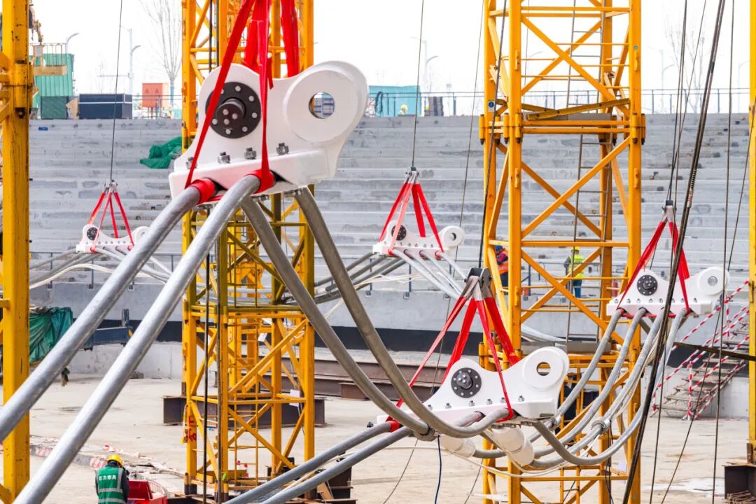 在雄安新區(qū)設(shè)立8周年之際,歷經(jīng)一千余天匠心雕琢的雄安體育中心,于3月30日正式投用。巨力索具承擔(dān)了雄安體育中心—體育場和游泳館項(xiàng)目國產(chǎn)高釩密封索、索夾的生產(chǎn)供應(yīng)以及施工安裝工作。