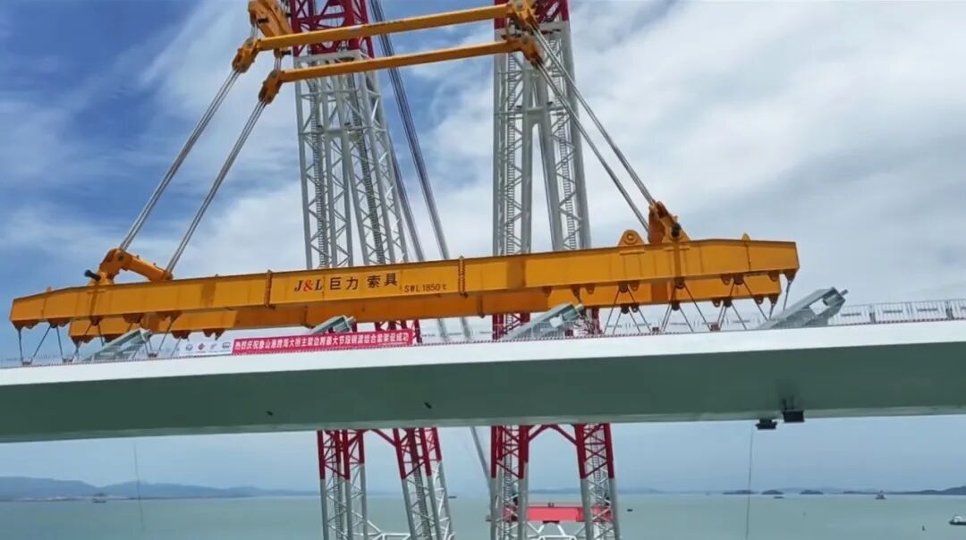 早在2024年11月,巨力索具便以定制化吊具助力該橋重達1700噸的首榀預制箱梁精準落位。該箱梁長60米、寬10.6米,是國內市域鐵路工程中跨度最大、噸位最重的預應力混凝土預制箱梁,橋面至海面距離最大約52米,接近20層樓高度,且毗鄰既有象山港公路大橋,操作空間狹小,對吊具穩定性、吊裝精度和施工安全性要求極高。