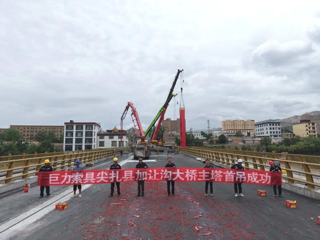 6月20日,在中國(guó)射箭之鄉(xiāng)——青海省尖扎縣的建設(shè)工地上,加讓溝大橋建設(shè)正熱火朝天地有序進(jìn)行,主塔首吊作業(yè)取得圓滿成功。巨力索具股份有限公司承建了該項(xiàng)目的所有上部懸索結(jié)構(gòu),包括基座及主塔鋼結(jié)構(gòu),索鞍和索夾鋼結(jié)構(gòu),懸索橋主纜,吊桿用鋼拉桿及錨固鋼拉桿。巨力索具憑借其強(qiáng)大的綜合實(shí)力,一舉滿足了該項(xiàng)目的所有精密鋼構(gòu)件的制作和安裝工作。