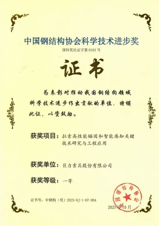 近日,2025年度中國鋼結構協會科學技術進步獎評審結果揭曉。在10月14日于廣西南寧舉行的頒獎典禮上,巨力索具股份有限公司憑借卓越的技術研發實力,一舉斬獲三項一等獎,充分彰顯了公司在高端索具技術領域的創新引領地位。