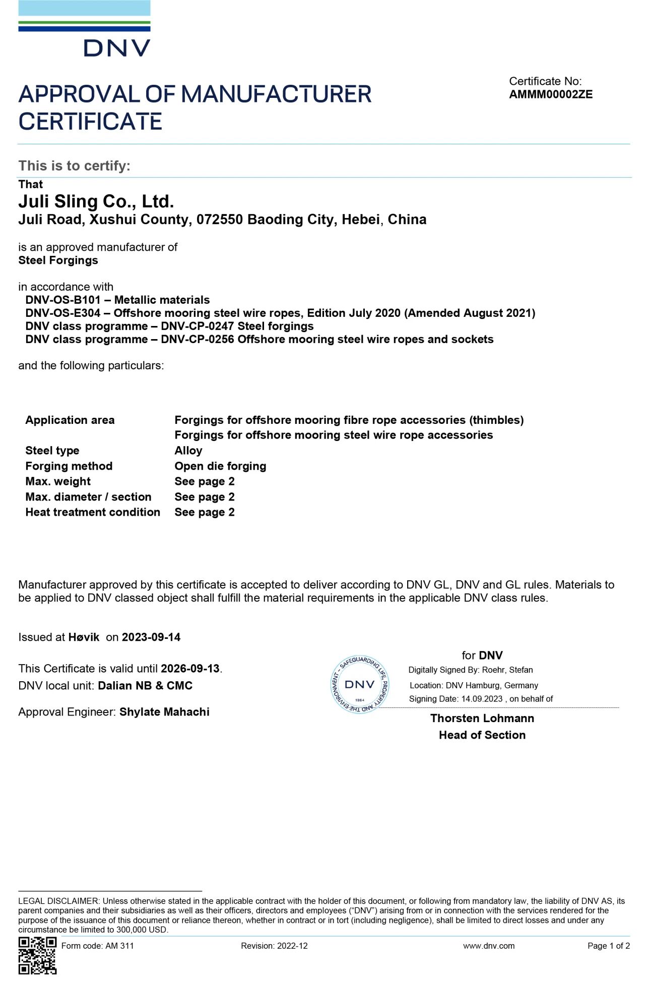 巨力索具先后取得挪威船級社(DNV)多項認證,逐步構建起較為完整的系泊產品認證體系。△ DNV焊接工廠認可證書△ 永久系泊用單股涂塑鋼絲繩的DNV·GL工廠認可證書△ DNV長期系泊鋼絲繩接頭及纜繩套環鍛件工廠認可證書