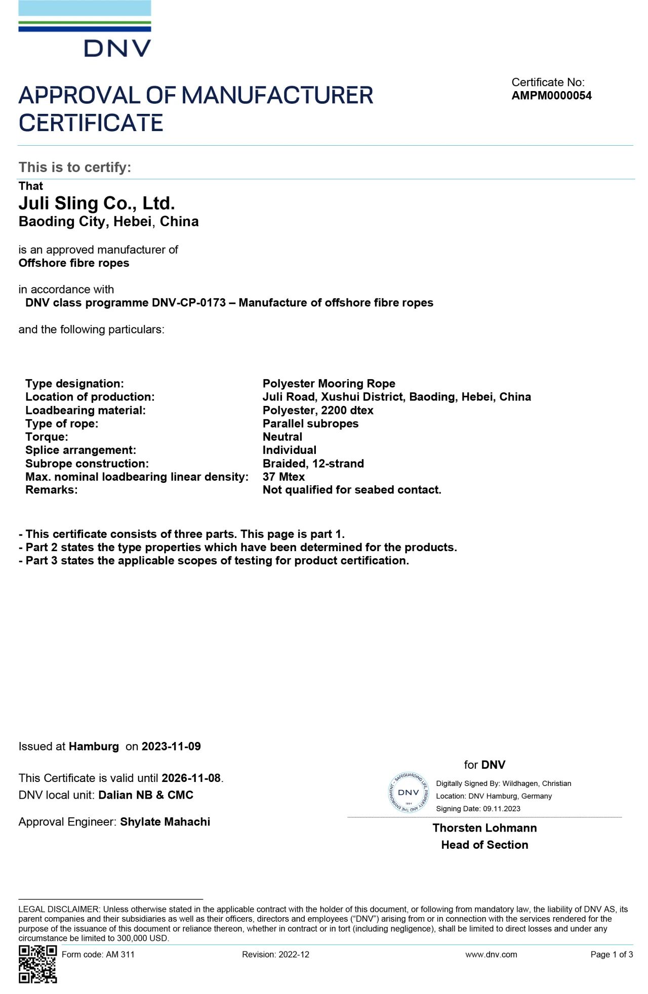 △ DNV長期系泊纜繩(滌綸)工廠認可證書法國船級社(BV)