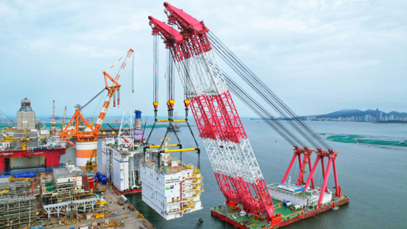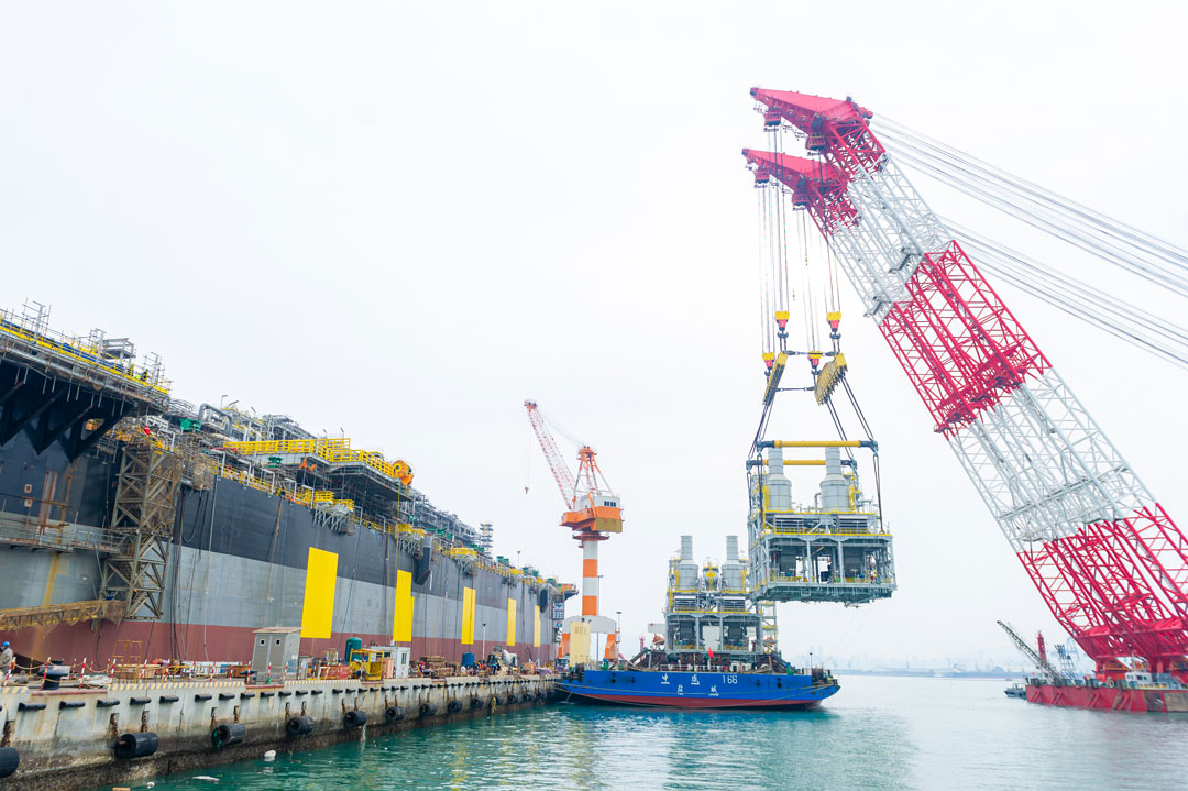 近日,中集來福士浮式生產儲油船(FPSO)重為3669噸的S20、2960噸的P60、2766噸的P20三大模塊吊裝完成。巨力索具為其提供了承載量為3000噸、2500噸的平衡梁梁式吊具、卸扣、無接頭繩索等產品,并為保證吊裝的順利進行制訂了嚴謹的吊裝方案。