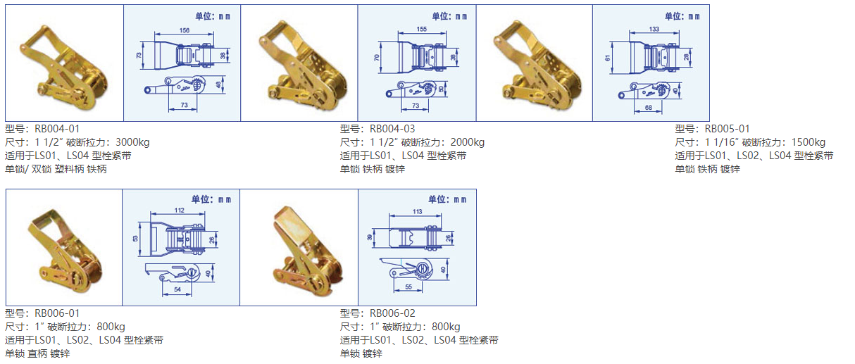 | 產品型號 | 適用尺寸 | 破斷拉力(kg) | 規格大小(mm) | 表 面 | 適合型號 | |||
